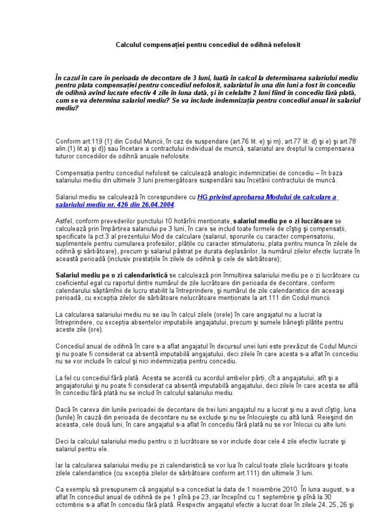 Calculul Compensaţiei Pentru Concediul De Odihnă Nefolosit