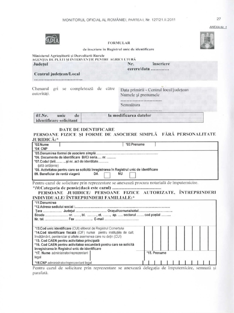 Formular De Inscriere In Registrul Unic De Identificare