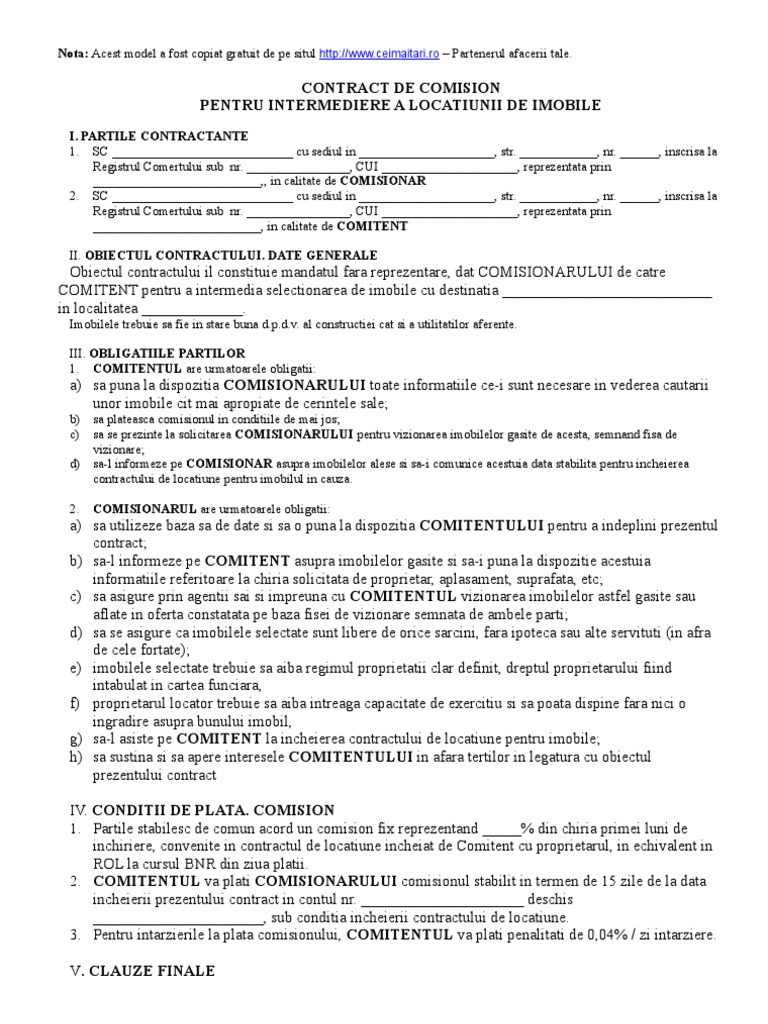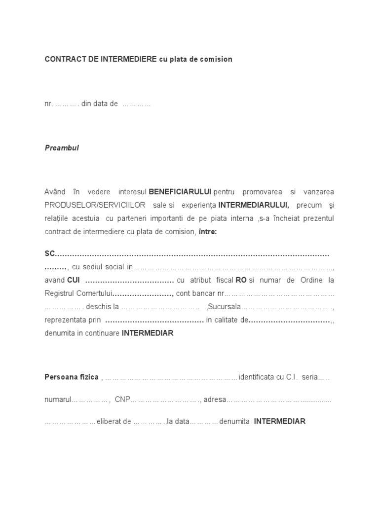 7 4 Contract De Comision Intermediere Doc Contract De Comision I Parti Contractante Art 1 S C Cu Sediul In Loc Str Inregistrata La Reg Com Sub Nr J Course Hero
