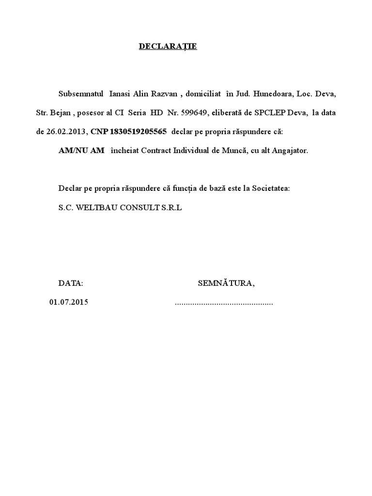 Model Declaratie Mai Multe Contracte De Munca Aatt