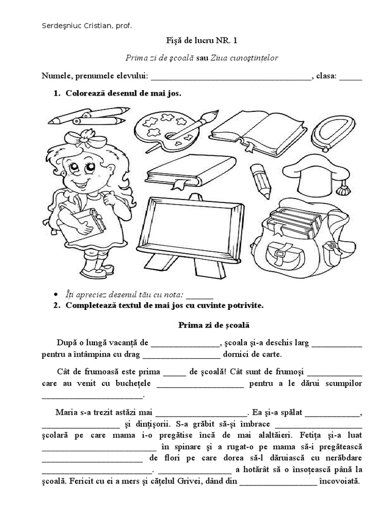 Fisa Pentru Prima Zi De Scoala Clasa 1
