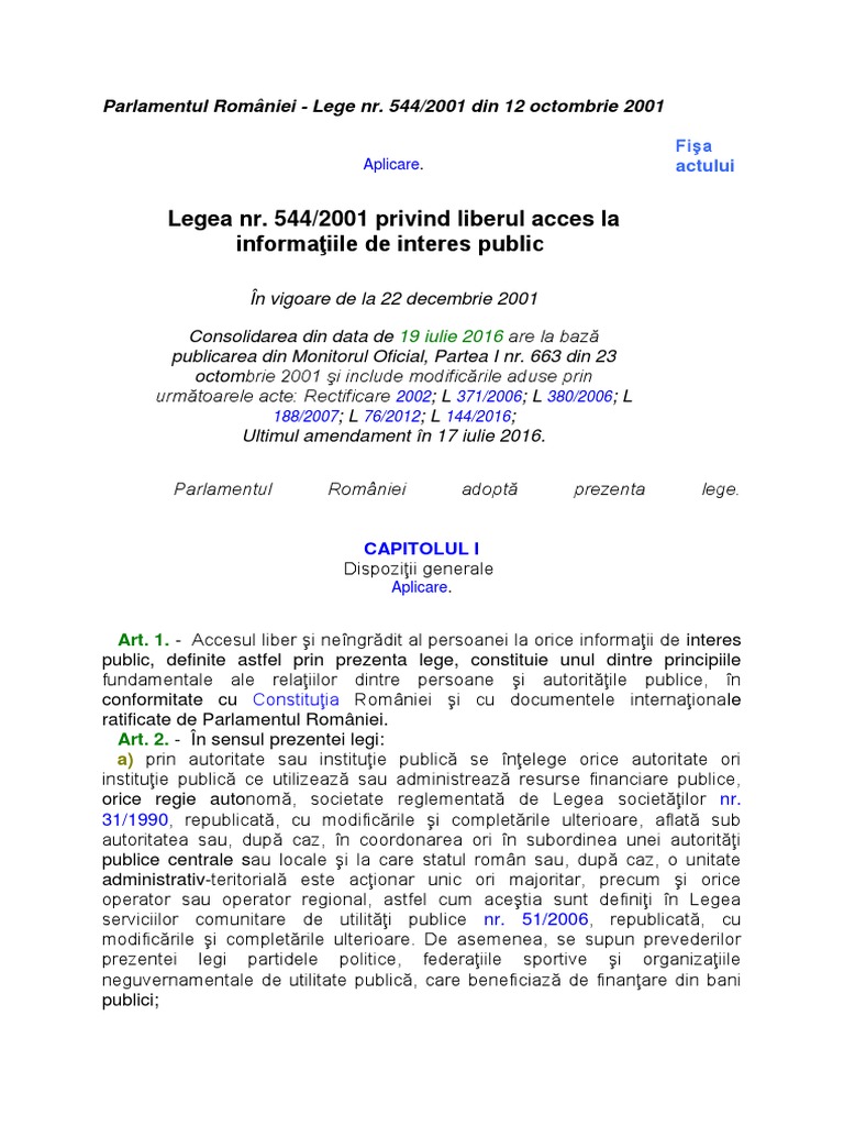 Legea Nr 544 2001 Privind Liberul Acces La Informaţiile De Interes Public