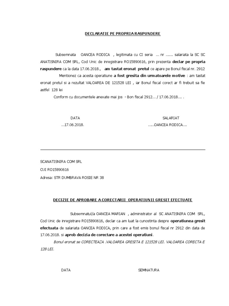 Proces Verbal De Anulare Bon Fiscal Gresit