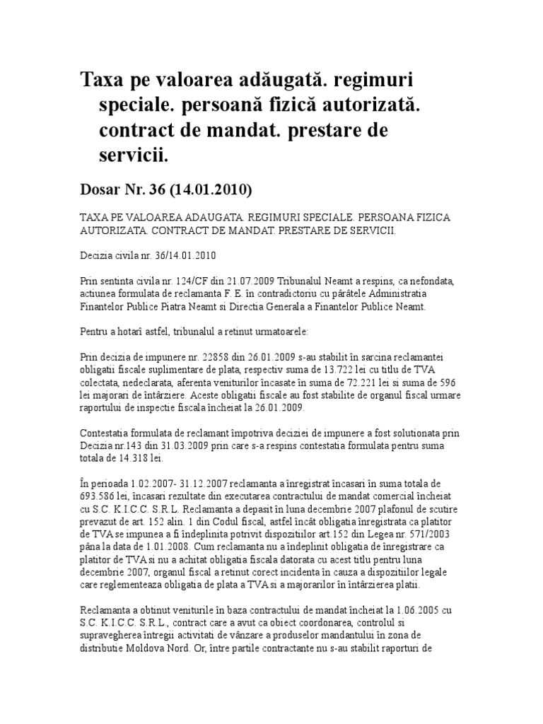 Taxa Pe Valoarea Adăugată Regimuri Speciale Persoană Fizică Autorizată Contract De Mandat Prestare De Servicii