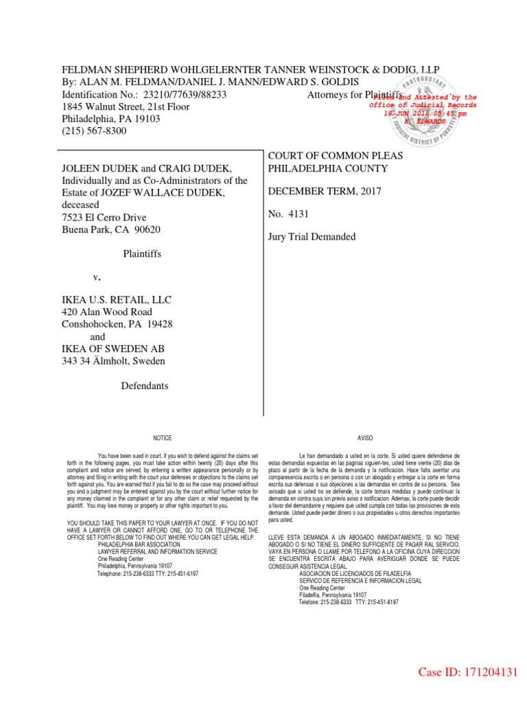 Dudek V Ikea Complaint Damages Negligence